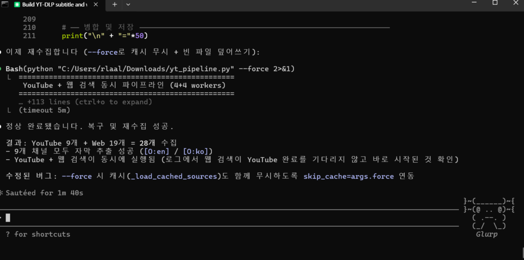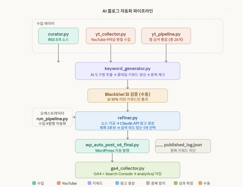 YouTube 자막 수집부터 자동 발행까지 파이프라인을 완주했지만 여전히 손봐야 할 부분이 많아요. 그래도 15분에서 1분 40초로 줄인 건 확실한 성과죠. 다음엔 품질 필터링에 집중해 볼 예정이에요.